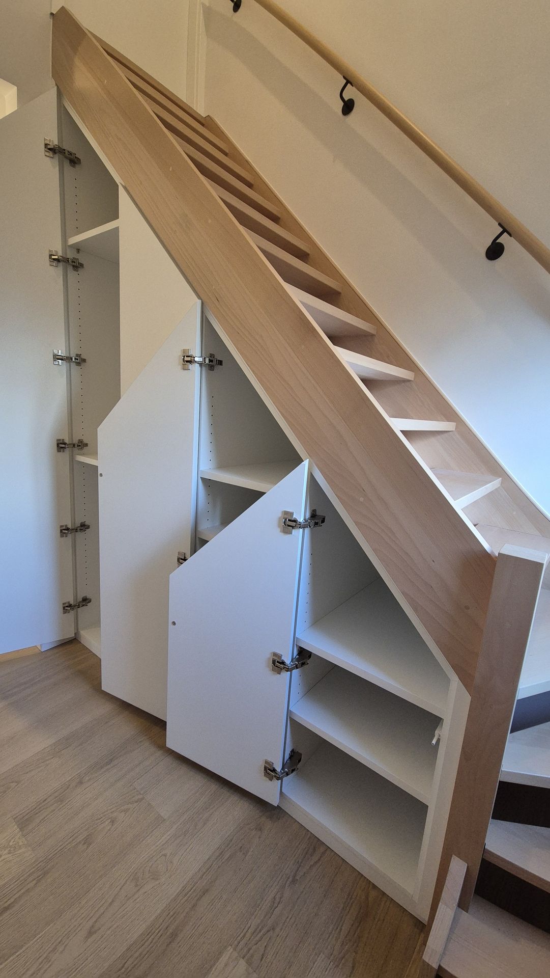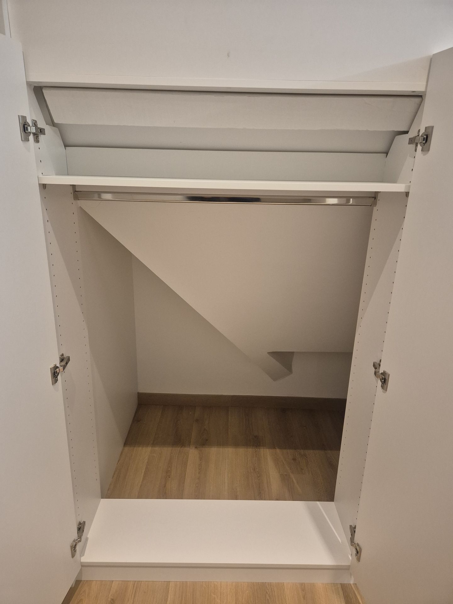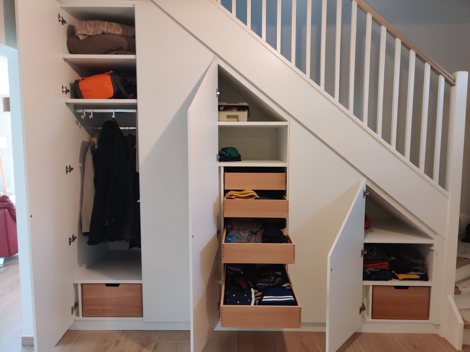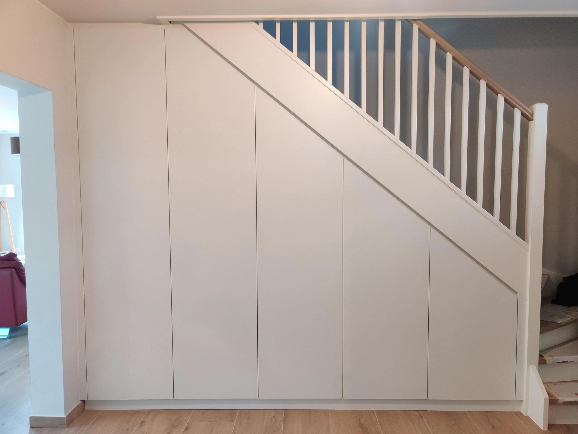 Vestiaire blanc sur mesure : l'espace sous l'escalier enfin rentabilisé. Rangement très profond, double penderie dont celle avant avec crochet et tiroirs individuels. L'entrée familiale parfaite.