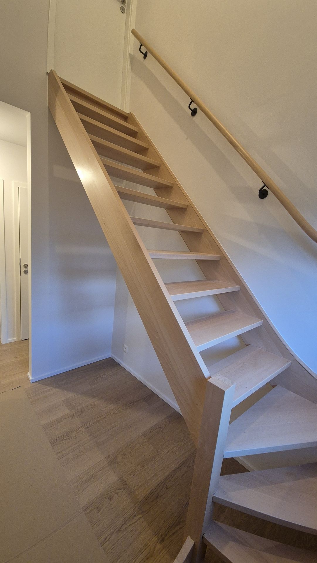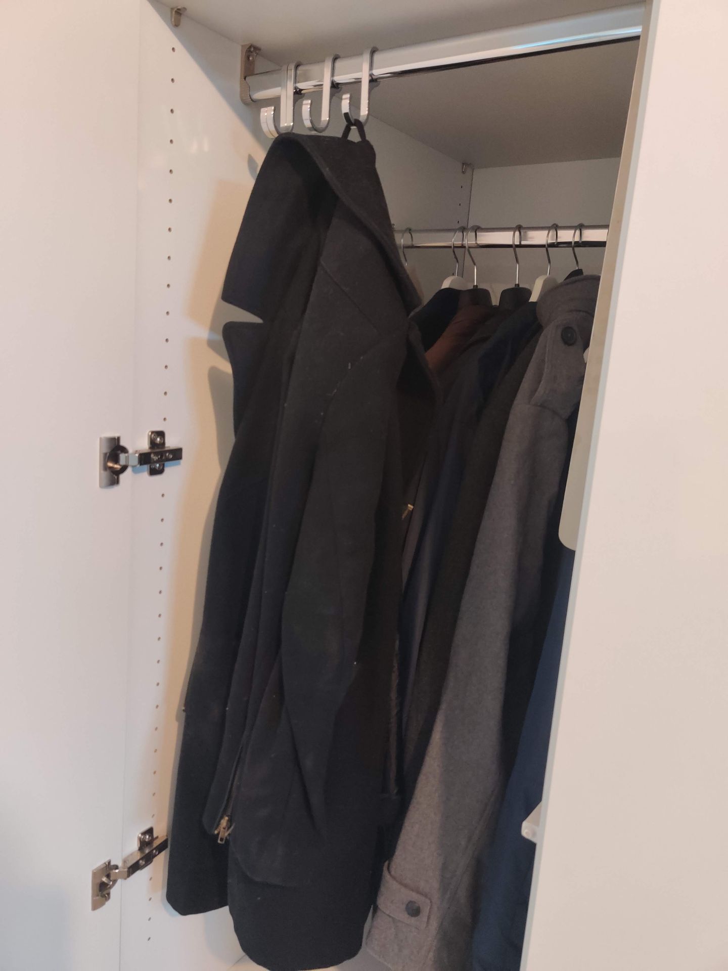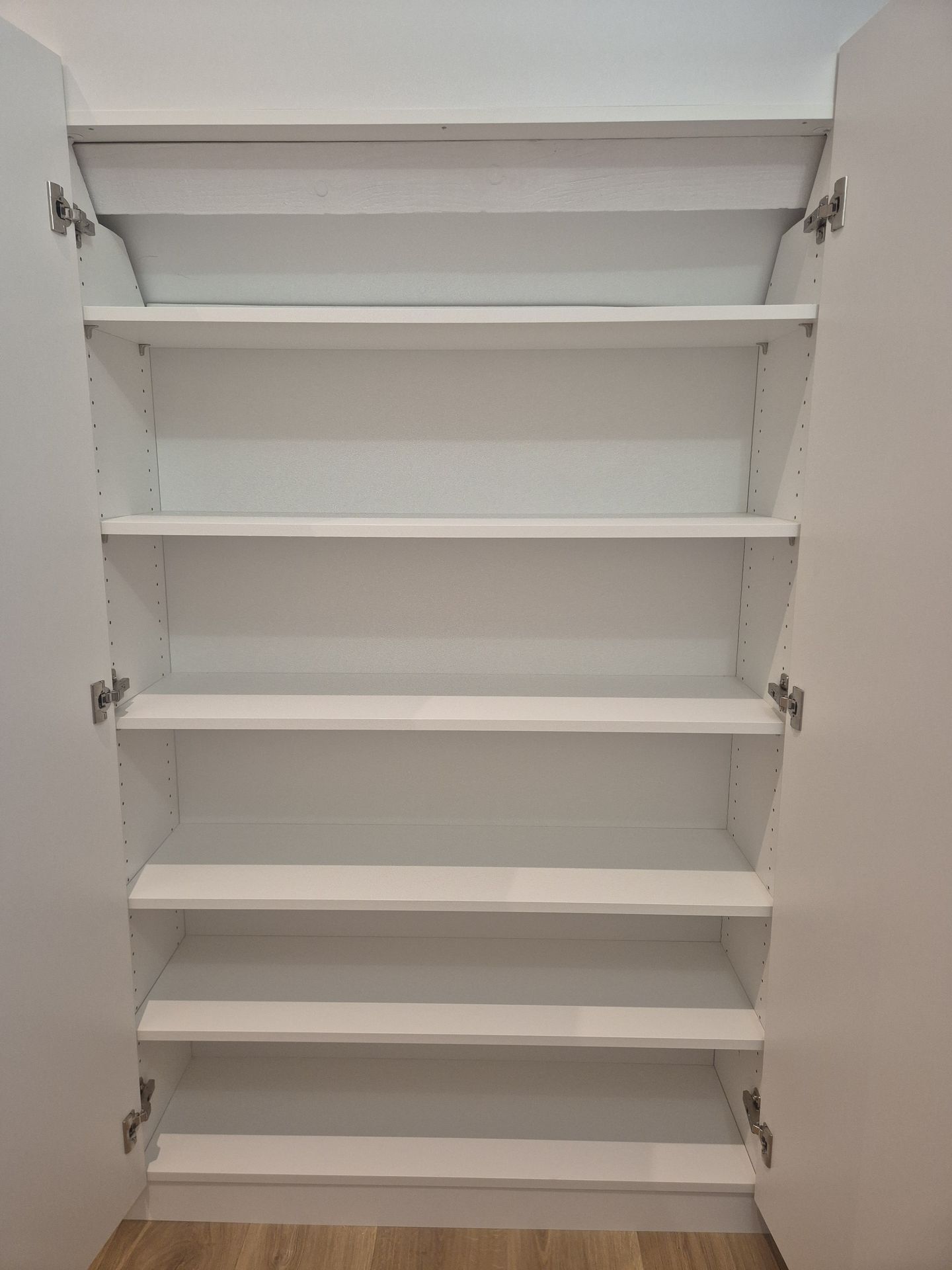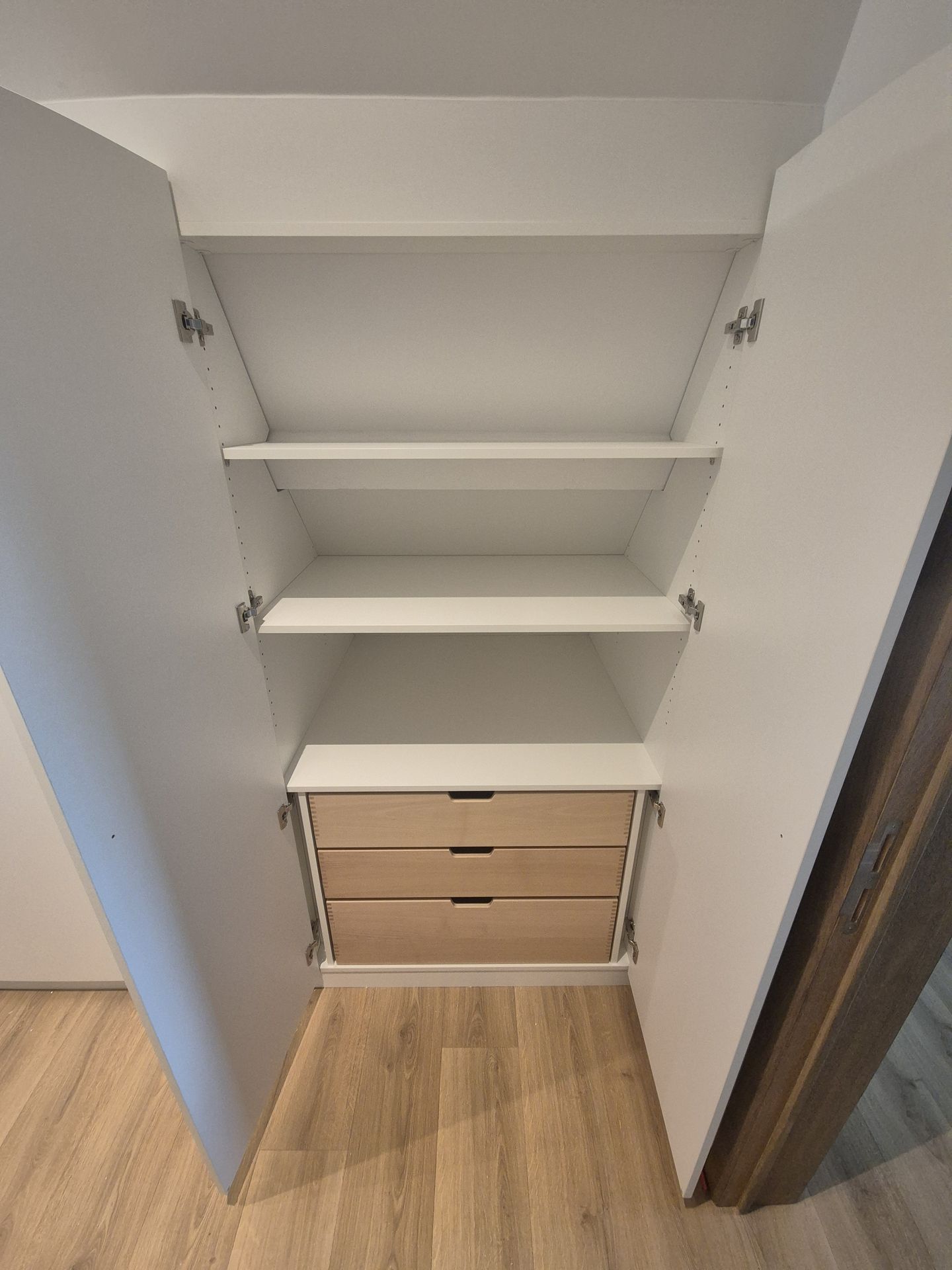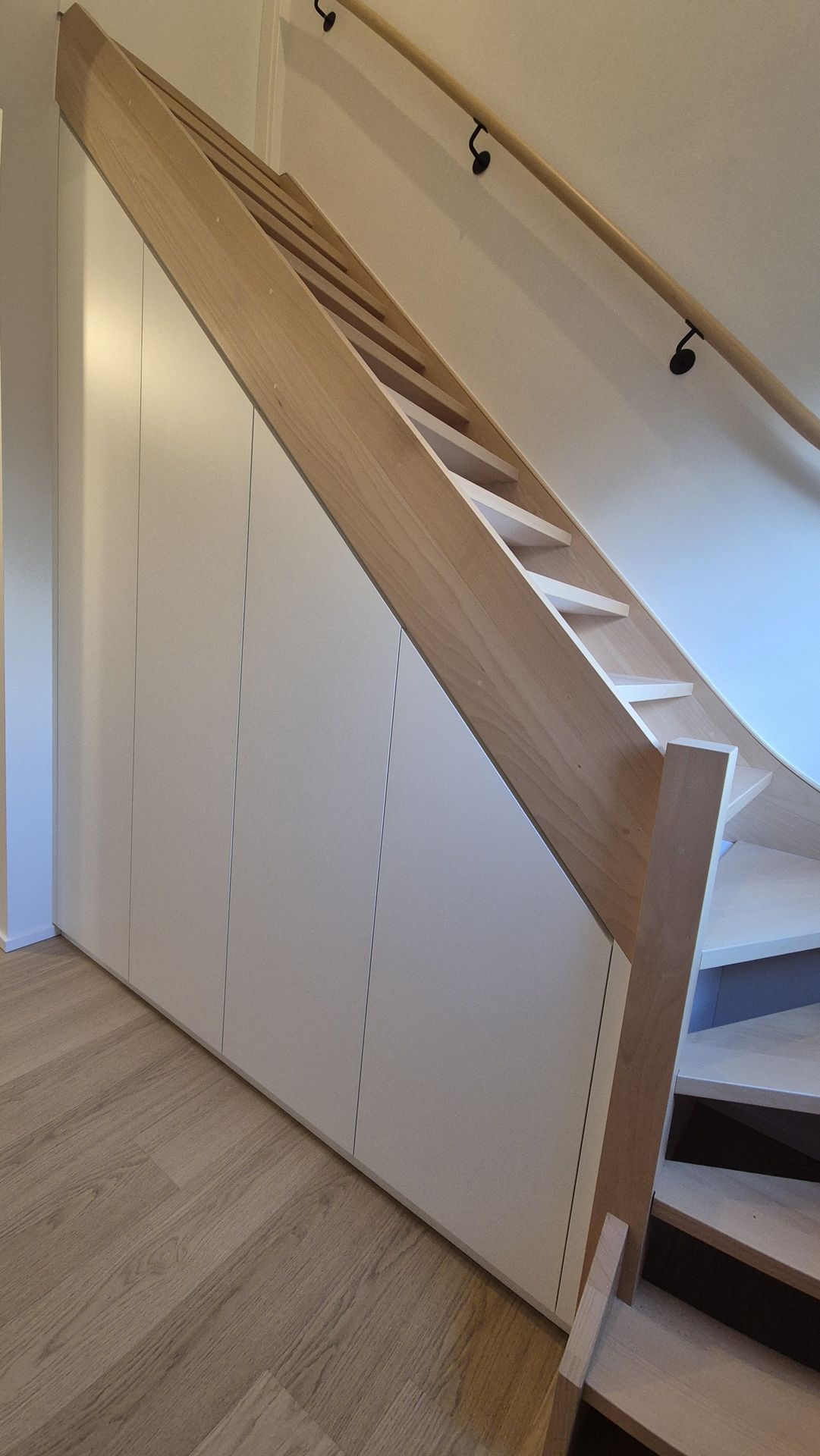 Vestiaire blanc sur mesure : l'espace sous l'escalier enfin rentabilisé. Rangement très profond, double penderie dont celle avant avec crochet et tiroirs individuels. L'entrée familiale parfaite.