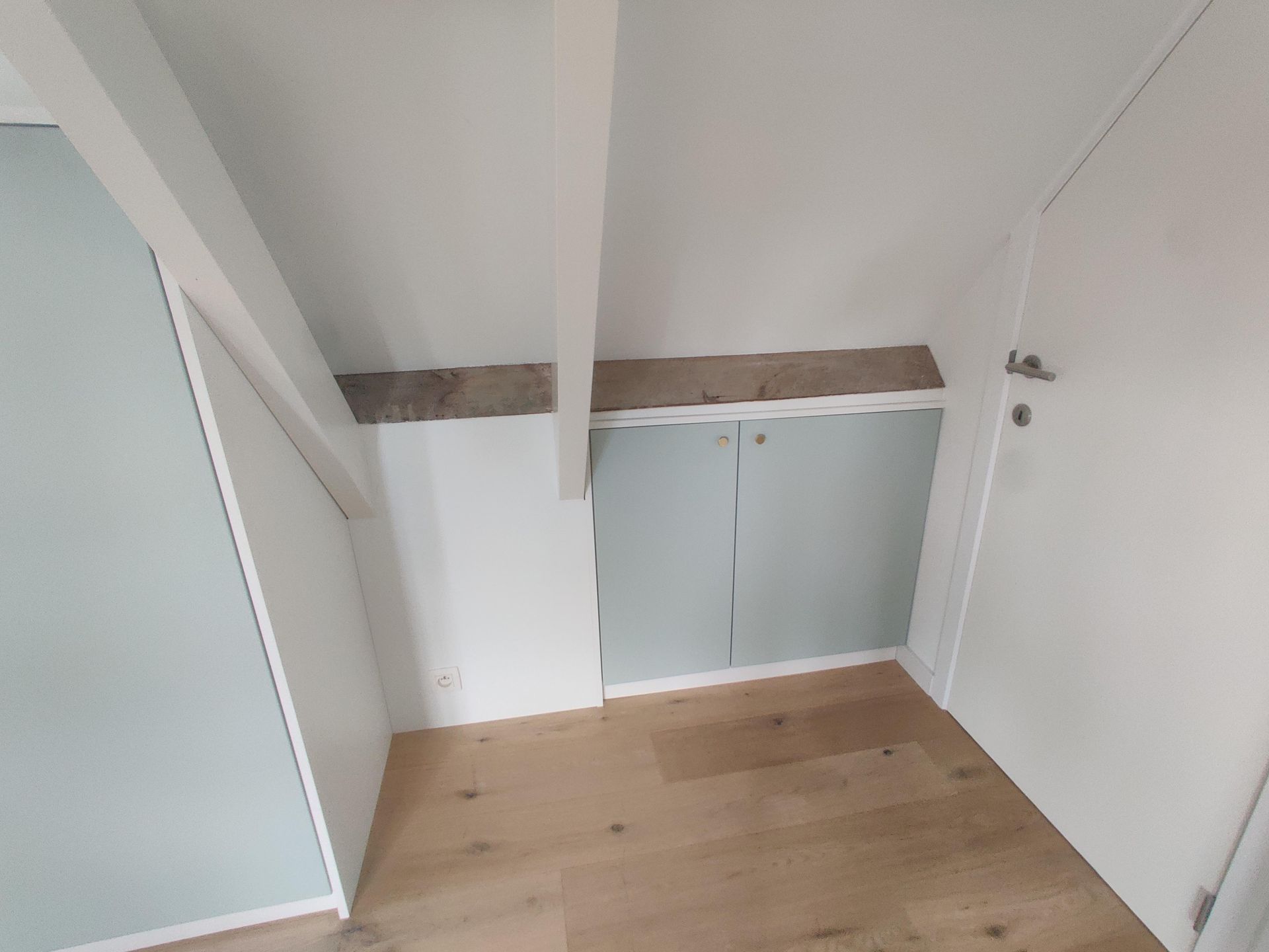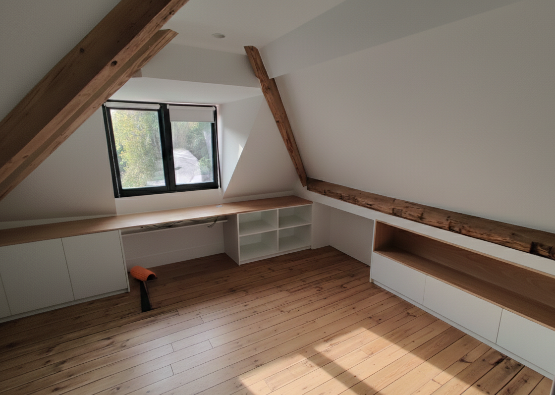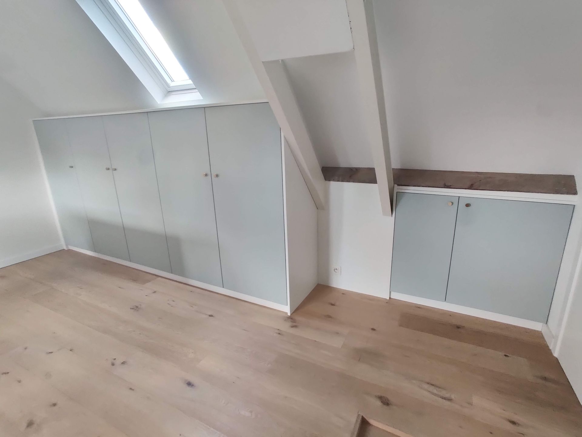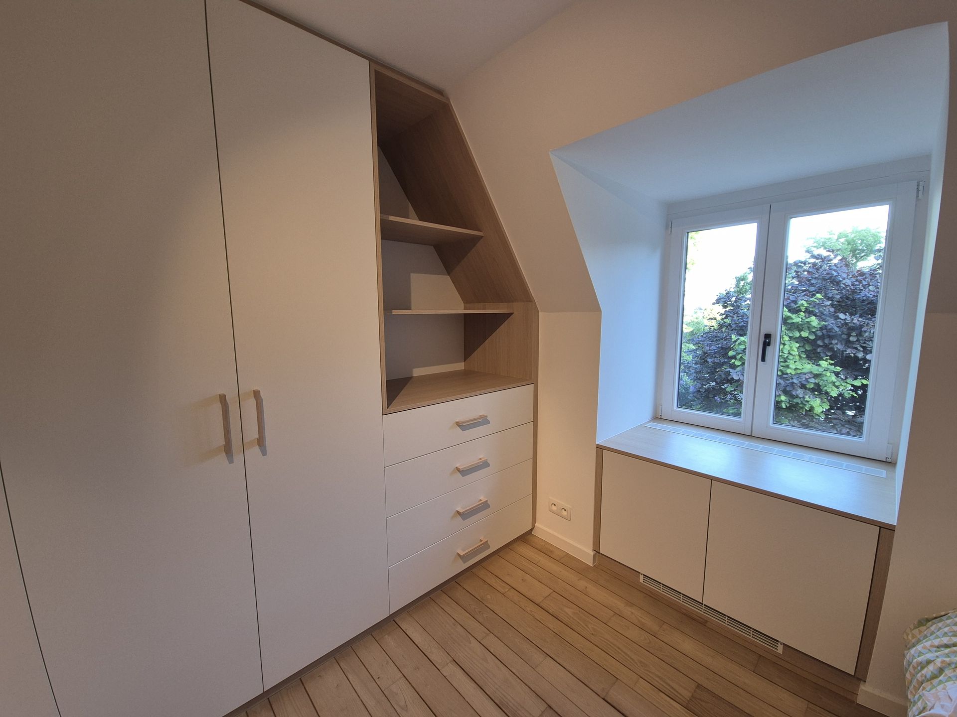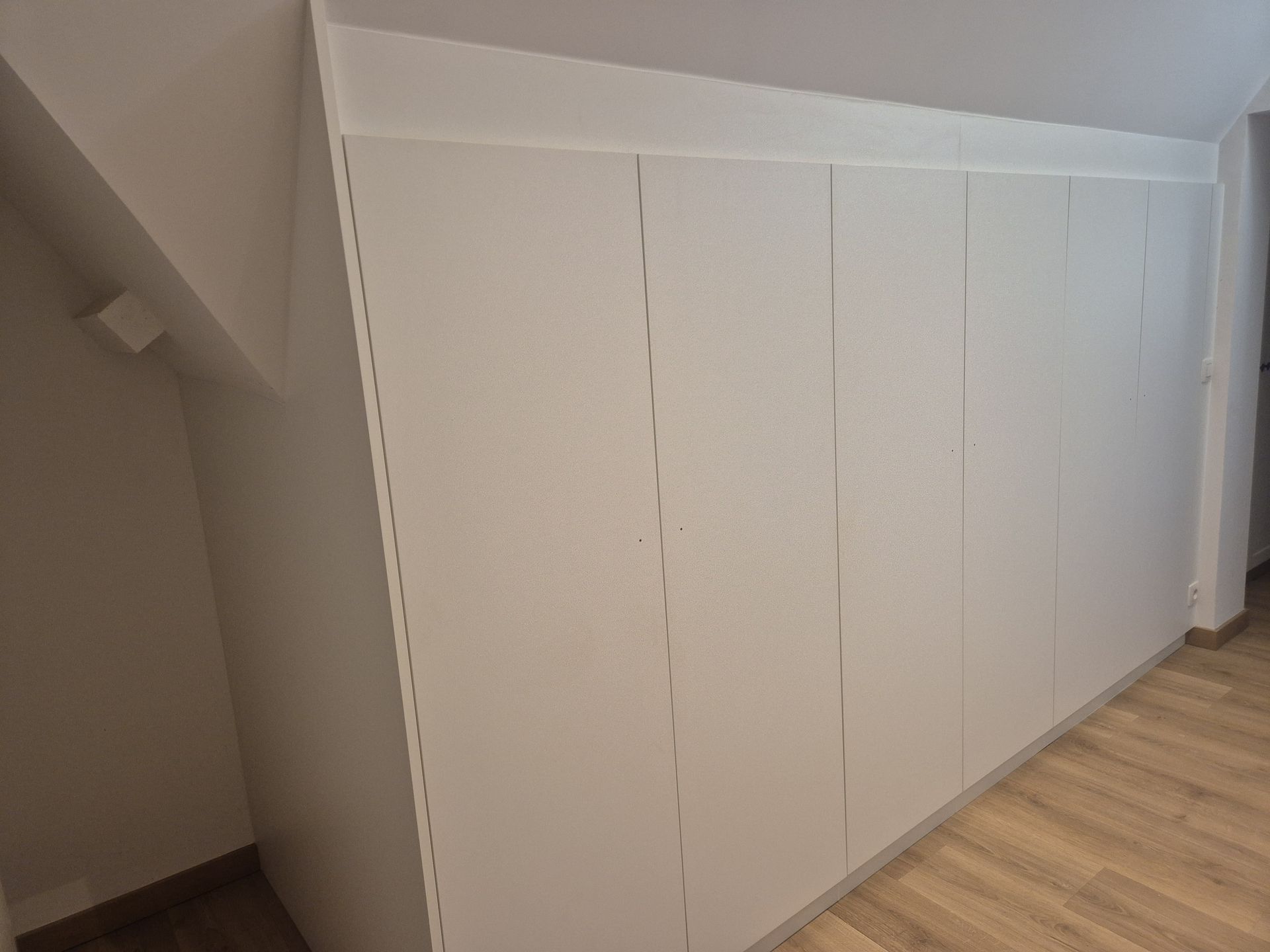 Aménagement de combles : une armoire sur mesure conçue pour épouser parfaitement la sous-pente arrière du grenier. Un gain de place considérable et un design parfaitement intégré.