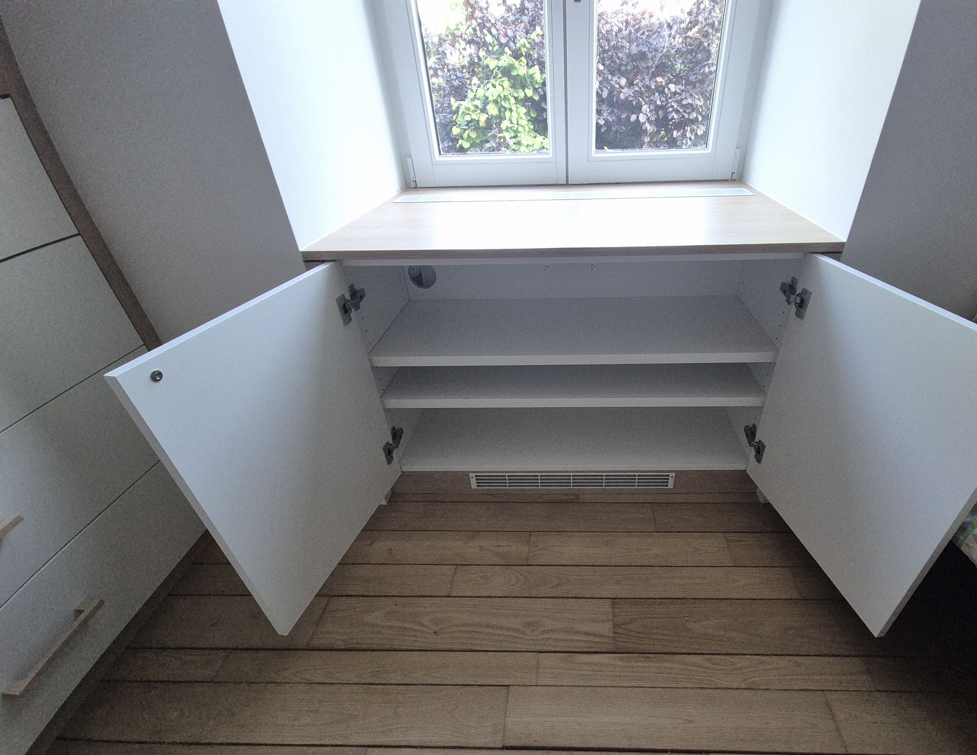 Chambre d’amis : alliance du blanc et du chêne pour ce placard et cette bibliothèque en sous-pente. Elle se prolonge sous la fenêtre avec un meuble à chaussures intégrant le radiateur. Un choix esthétique assumé pour un gain de place total. Découvrez l'avant/après.