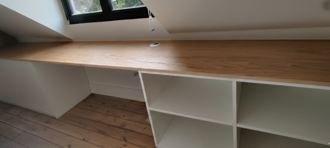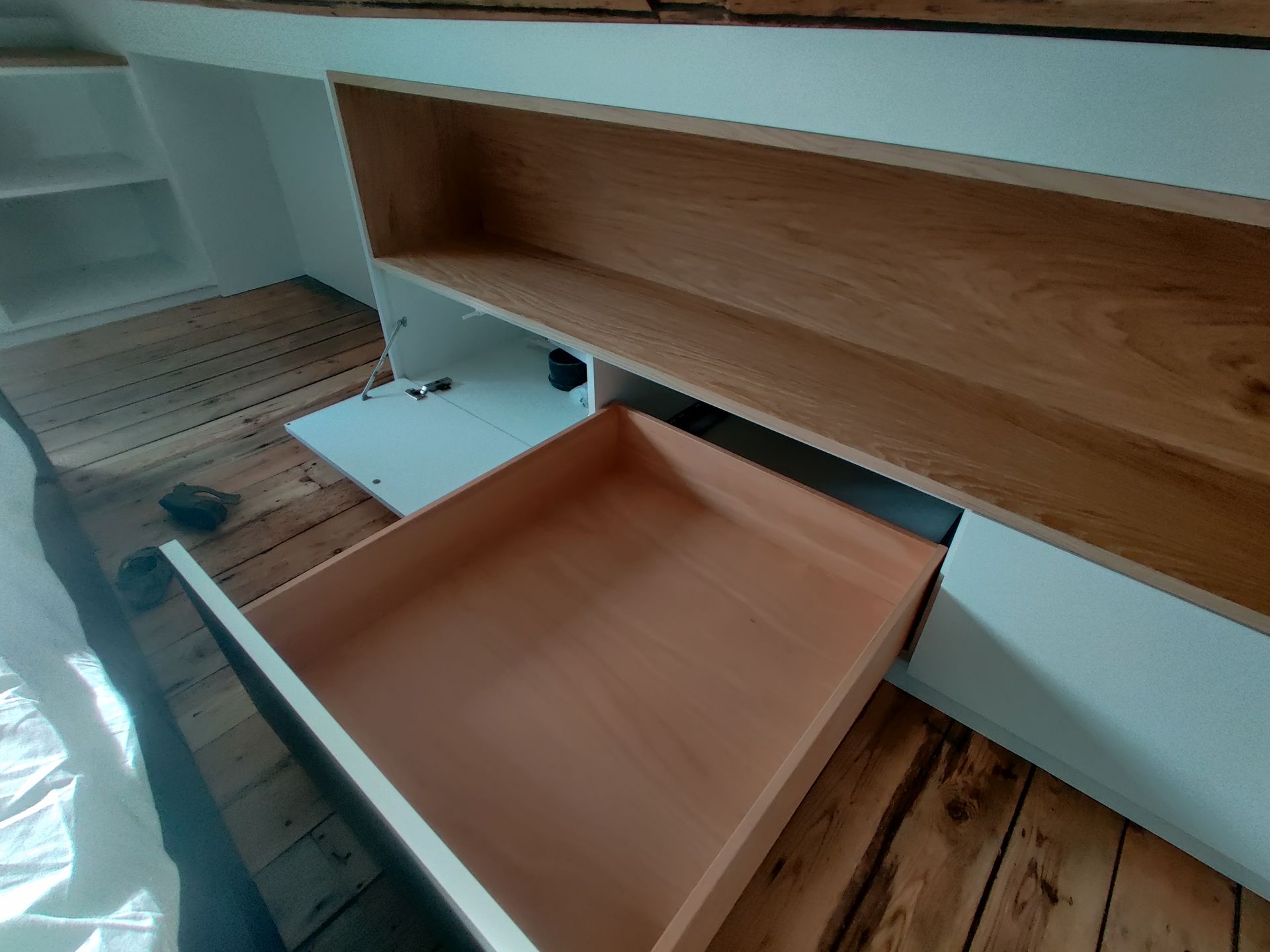 Exploiter chaque angle des combles pour en faire une chambre: création d'un bureau filant et d'une structure en chêne massif entourant le lit. Cette alcôve multifonctionnelle combine bibliothèque intégrée et tables de nuit pour un gain de place élégant et naturel
